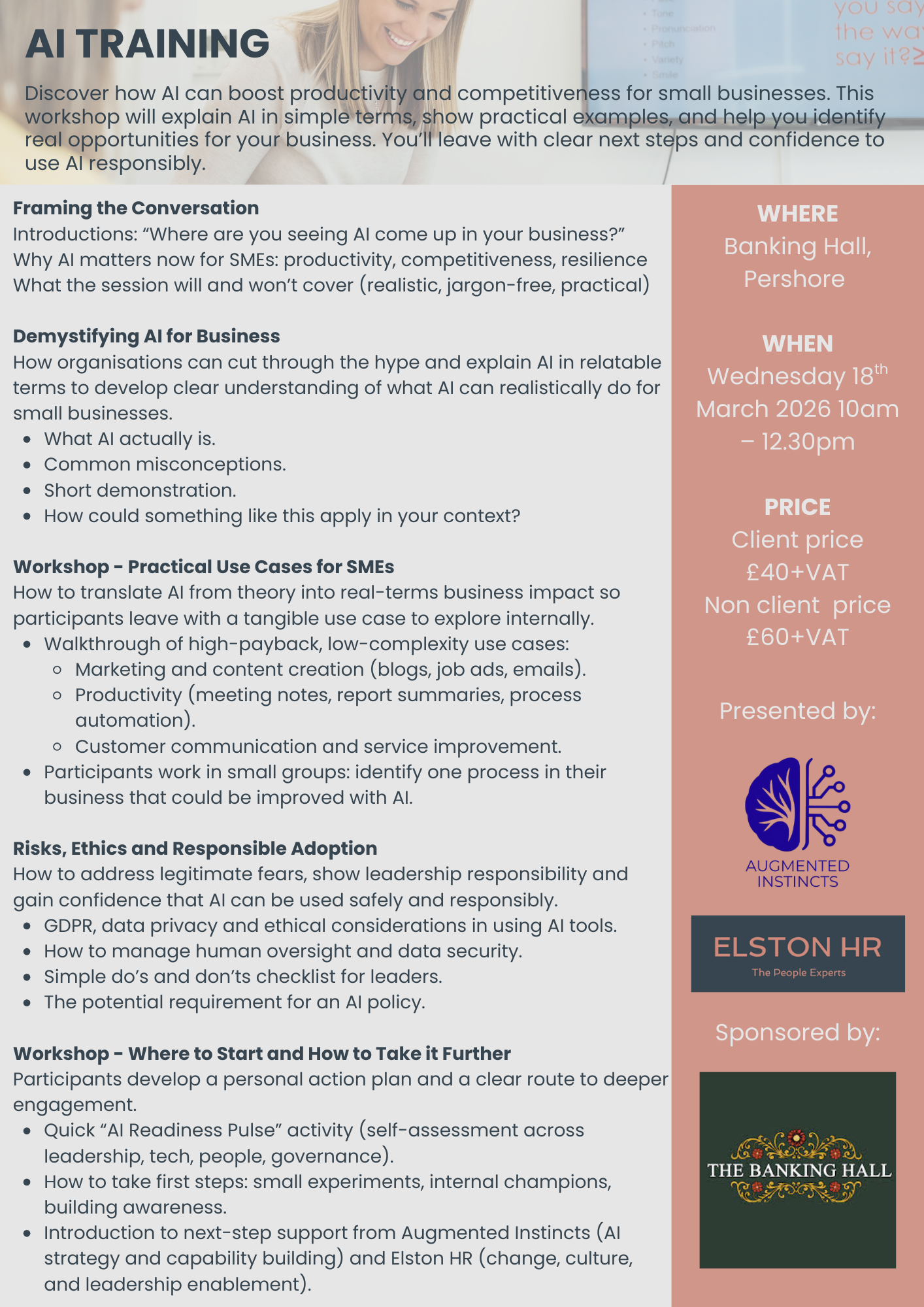 If you are looking to streamline operations, improve efficiency, and ensure your business stays competitive in an AI-driven landscape, this in-person workshop is designed for you.